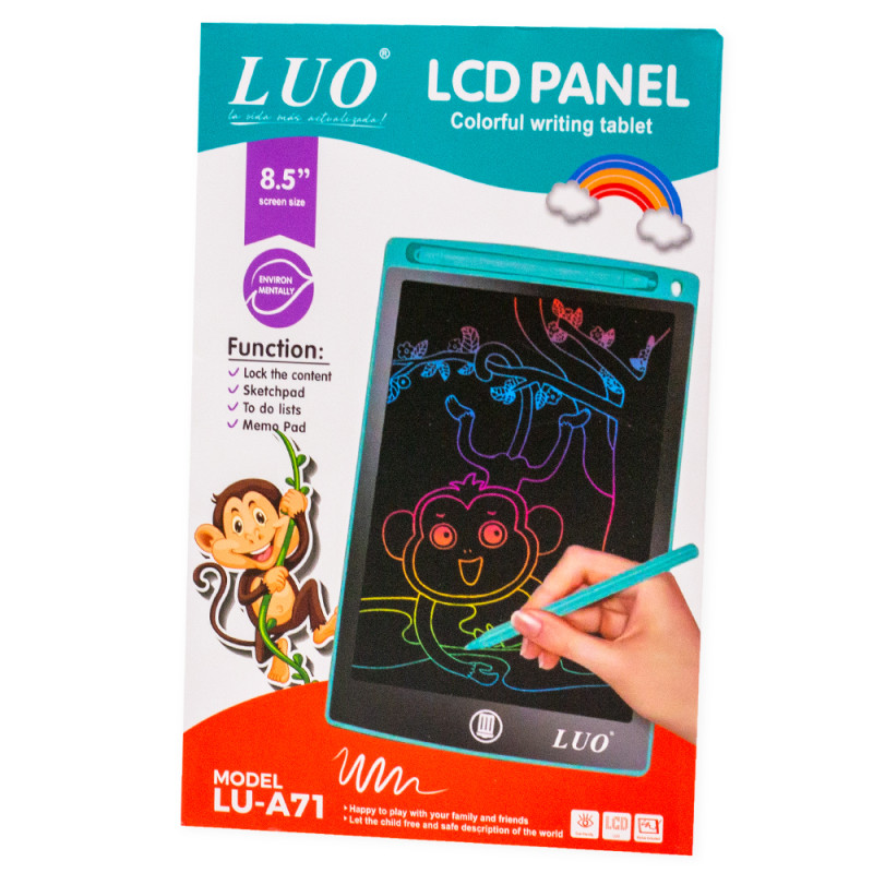 La LCD Writing Tablet LUO LU-A71 es la herramienta perfecta para dibujar, tomar notas y escribir de manera fácil y práctica. Con su pantalla LCD de 8.5 pulgadas, es ideal para todas las edades, proporcionando una experiencia de escritura sin riesgos para la vista. Además, cuenta con un modo "bloqueo de pantalla" y es resistente a caídas, lo que la hace perfecta para usar en cualquier lugar.